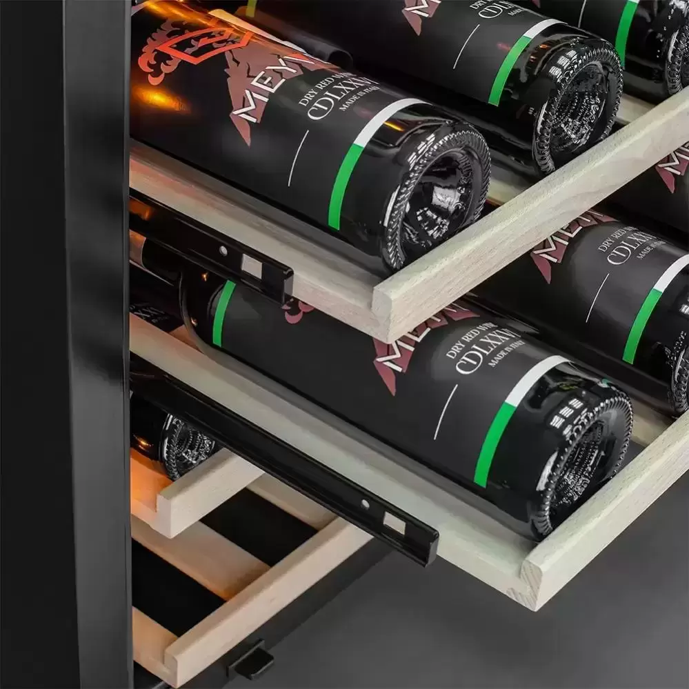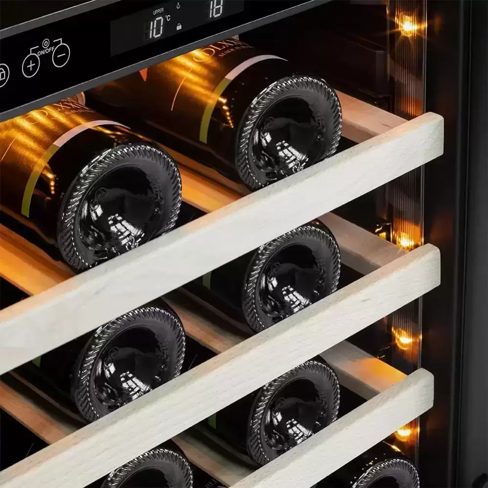 Двухтемпературный винный шкаф, Дверь со стеклопакетом, Материал полок дерево, Фильтр из активированного угля, Индикация повышения температуры, Внутреннее освещение |
